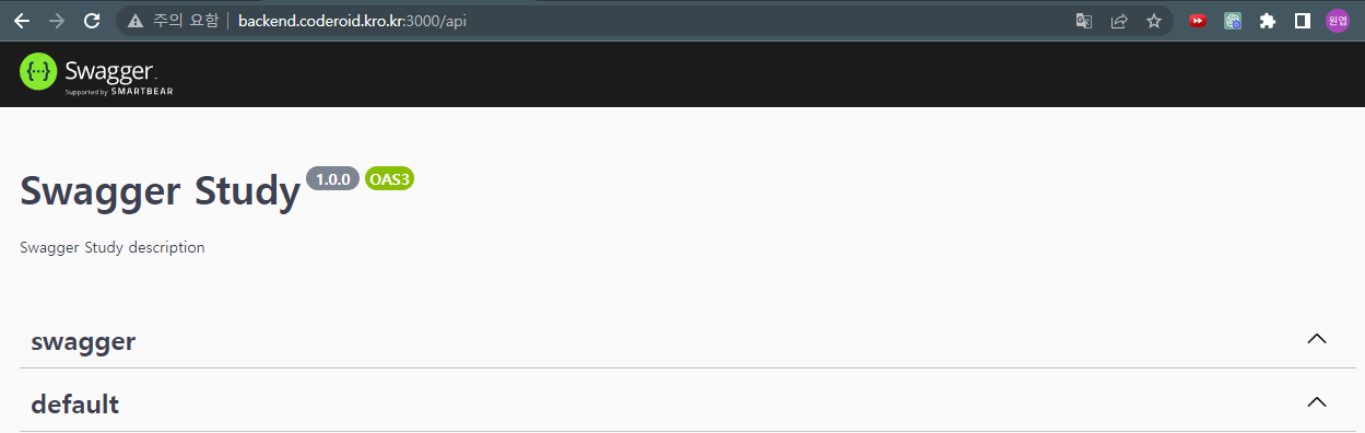 setup()에서 ‘api’ 는 문서의 주소를 의미하므로 localhost:3000/api 로 이동하면 만들어진 문서를 볼 수 있다.