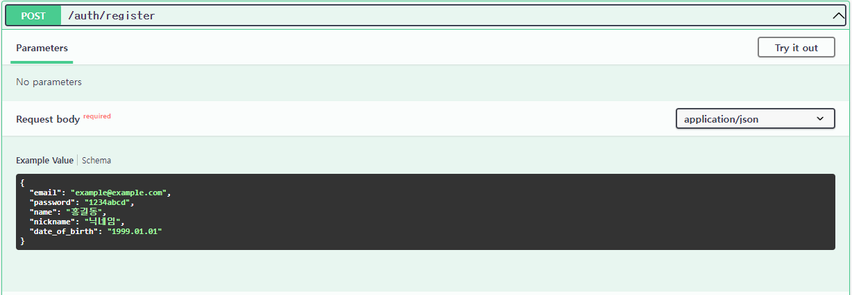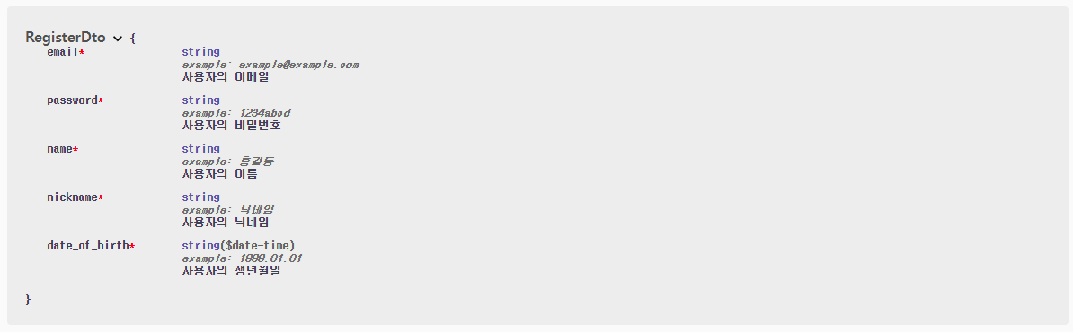 @ApiProperty()를 이용해 값의 예시와 설명을 적어줄 수 있다.